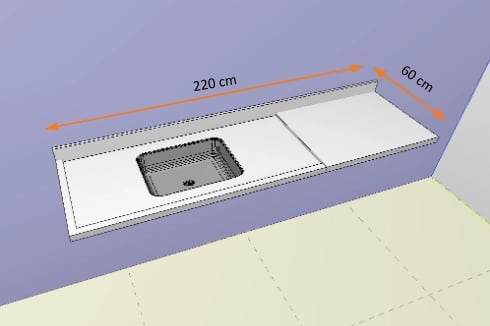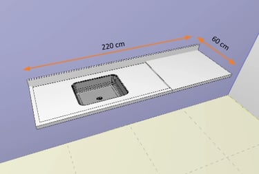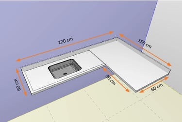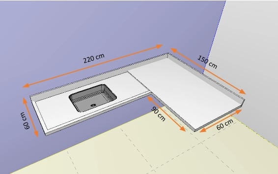 Aqui tomemos como calcular o granito de bancada de canto considerando a medida de: 220 x 150 x 60 cm.