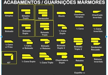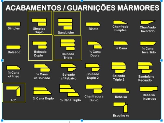 As destacadas são as mais utilizadas em bancadas de cozinhas: Simples duplo, boleado, 45º e sanduíche e boleado triplo.
