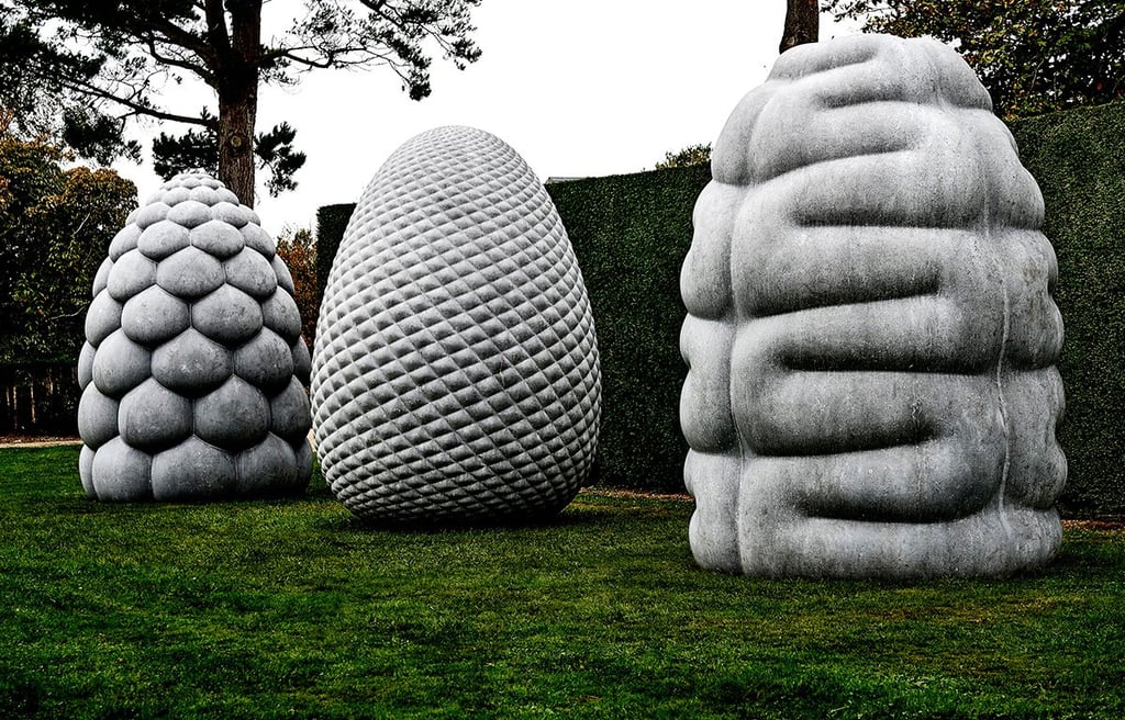 Peter Randall-Page tem obras famosas que exploram as formas orgânicas e padrões encontrados na natureza, utilizando a textura granulada do granito para complementar seus temas.